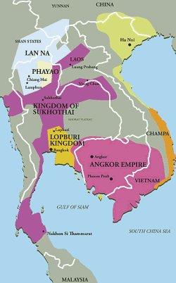 Les Thaïs font remonter la fondation de leur nation au XIIIème siècle, c’est donc là que nous allons commencer. Avant cela, aux IXème et Xème siècles, la région était sous domination khmère. C’est seulement pendant les XIème et XIIème siècles que les Thaïs, originaires de Chine, s’y installèrent. Ils s’affranchirent de l’empire khmer à Sukhothai, qui devint un royaume souverain en 1238. Cet événement marque traditionnellement le point de départ de l’histoire de la nation thaïe moderne.